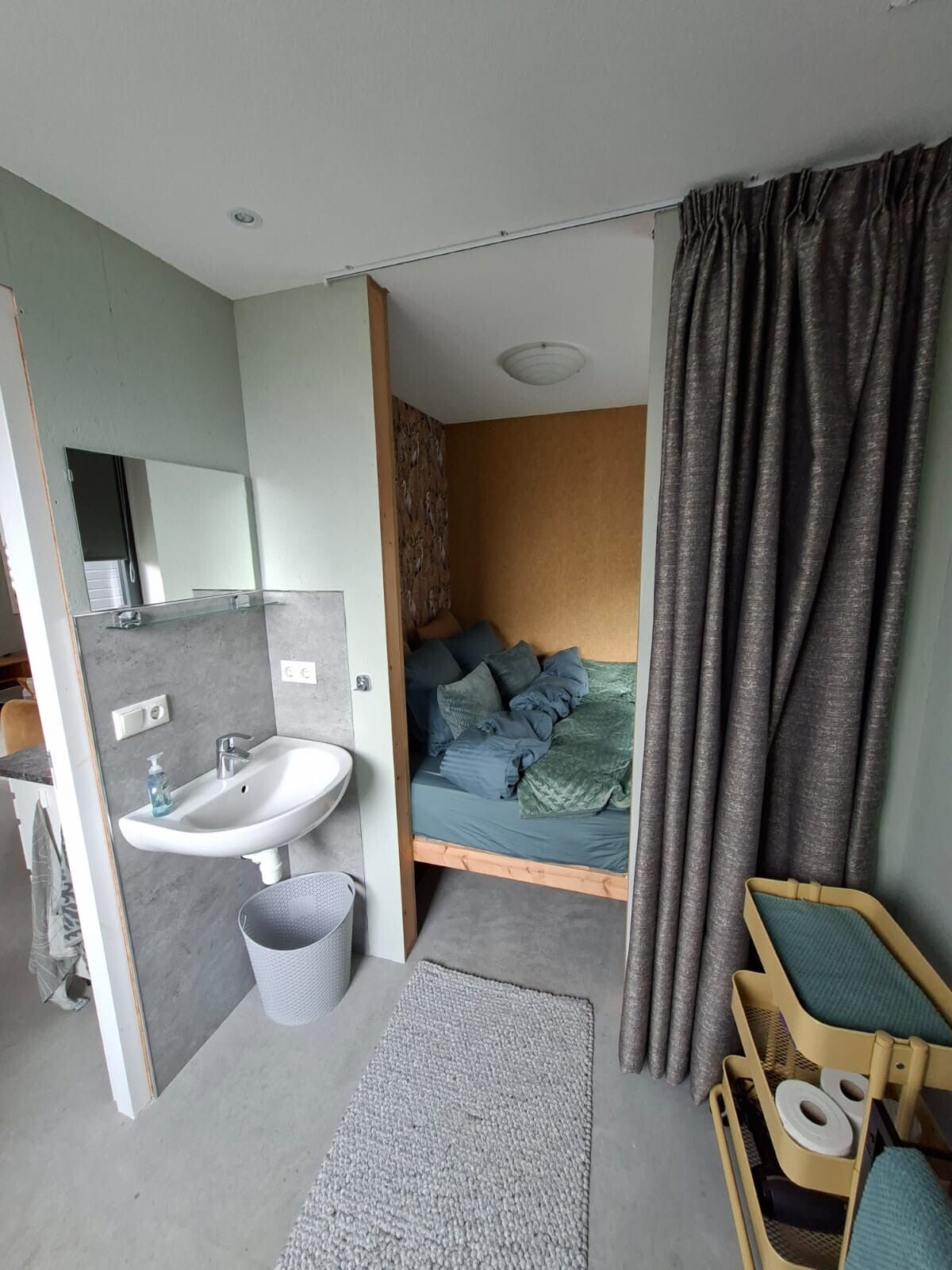 Direct vanuit uw slaapruimte stapt u in uw eigen moderne badkamer. Deze ensuite opstelling zorgt voor gemak, zodat u zich volledig kunt ontspannen en opfrissen. Alles wat u nodig heeft voor een comfortabel verblijf is hier binnen handbereik, perfect geïntegreerd in het compacte design van ons tiny house